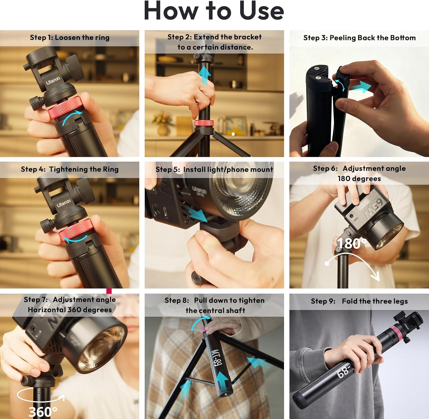 The ULANZI MT-89 features a portable adjustable light stand with a 1/4″ screw quick release, allowing you to effortlessly switch between your camera, video light, or smartphone. Whether you’re shooting in the studio or outdoors, this tripod provides the stability and flexibility you need to achieve the perfect shot. Its extendable legs and adjustable height make it suitable for various shooting angles and conditions.